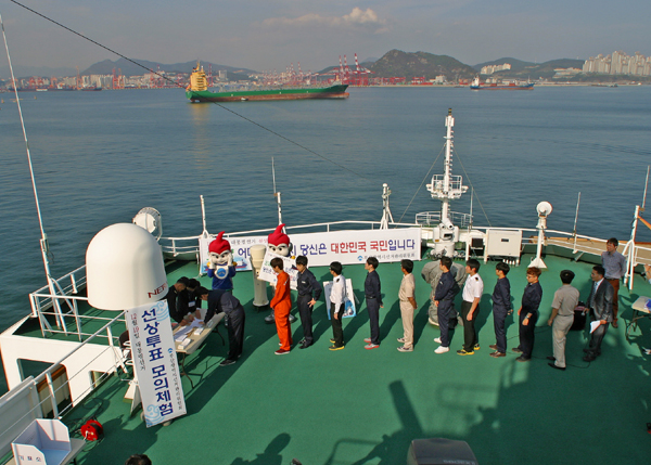부산시선거관리위원회는 오는 12월 대선에 처음 도입되는 선상 부재자투표를 앞두고 29일 한국해양대 실습선 한바다호에서 모의 투표 체험을 실시했다.