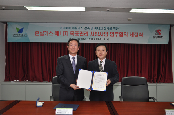 선박안전기술공단(이사장 부원찬)은 쌍용해운 주식회사(대표이사 한준석)와 지난 11월 7일 본부 12층 대회의실에서 「연안해운 온실가스․에너지 목표관리 시범사업 협약」을 체결하였다.