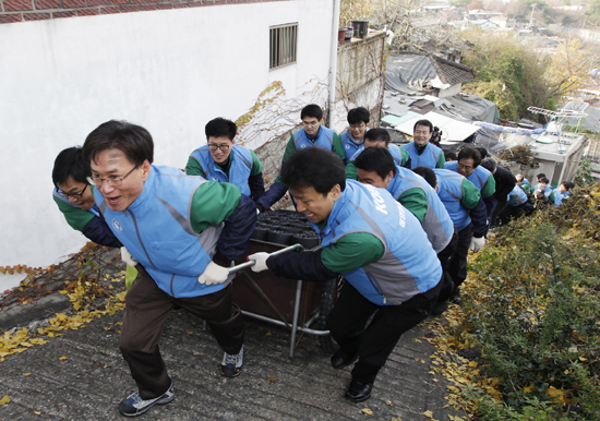 불암산 기슭에 자리한 104마을은 길이 좁고 가팔라서 차가 다닐 수 없어 지게로만 연탄운반이 가능하다. 생전 처음 지게를 사용하느라 힘들어하던 젊은 직원들은 나이가 지긋한 선배들에게 사용법을 배우며 이내 능숙하게 연탄을 날랐다. 지게조차 들어가지 못할 정도로 좁은 길에선 일렬로 늘어서 손에서 손으로 사랑의 연탄을 전달했다.
