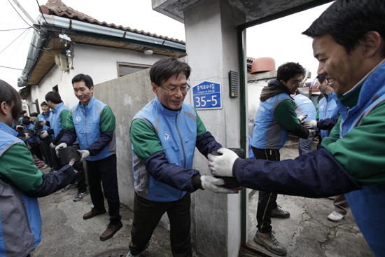 지난 16일 아침, 서울의 마지막 달동네 104마을에 반가운 손님이 찾아왔다. 바다를 깨끗이 가꾸는 일을 하는 해양환경관리공단의 곽인섭 이사장을 비롯한 바다사랑봉사단 85명이었다. 바다사랑봉사단은 혹한이 예고된 올해 겨울에 대비하여 영세독거노인 등 어려운 이웃을 돕기 위해 자발적으로 성금을 모았고, 모은 성금으로 연탄 만장을 마련해 ‘사랑의 연탄 배달’ 자원봉사를 실시했다.