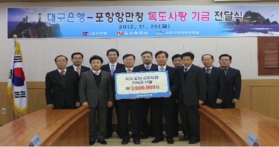 포항지방해양항만청(청장 노진학)은 독도사랑을 지속적으로 펼쳐온 대구은행(행장 하춘수)과 함께 독도등대 직원후생 복지기금 전달식을 20일 포항항만청에서 가졌다.