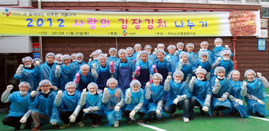 CJ대한통운(대표 이현우)은 ‘2012 사랑의 김장김치 나누기’ 행사를 가졌다고 22일 밝혔다.서울 중구 약수노인종합복지관에서 열린 이날 행사에서 CJ대한통운 임직원 백여 명이 김장김치 3천600kg을 손수 담갔다.