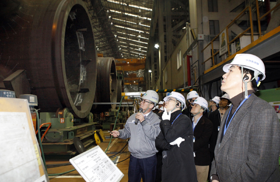 이번 학술시찰에는 교육과학기술부가 주최하고 한국과학창의재단이 주관하는 '올해의 과학교사상' 수상자 39명이 참가, 이들 일행은 27일까지 경남 창원의 산업 현장과 일본 오사카 지역의 과학 관련 박물관, 오사카 부립 고즈고등학교 등을 방문해 과학기술 및 교육 현장을 체험하게 된다. (사진:연강재단 학술시찰에 참가한 과학교사들이 두산중공업 원자력 공장을 둘러보고 있다.)
