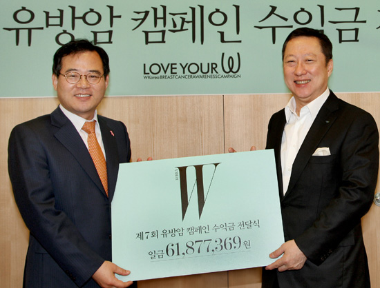이날 오전 노동영 한국유방건강재단 이사장, 박용만 두산그룹 회장 등이 참석한 가운데 서울 중구 두산타워에서 열린 전달식에서 ‘더블유 코리아’는 수익금 6천180만 원을 전달했다. <더블유 코리아>는 ‘Love Your W’ 캠페인을 위해 지난해 10월18일 패션계, 뷰티업계, 문화계, 예술계, 연예계 등 인사들을 초청해 디너 행사를 갖고 기금을 마련했다.