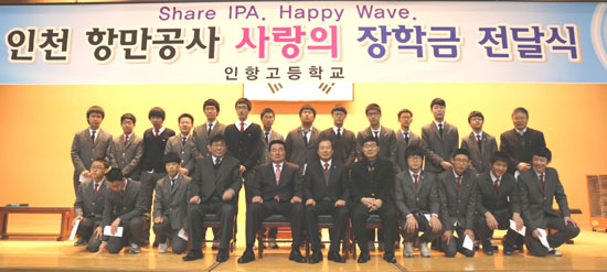 이날 전달된 장학금은 IPA가 인천항의 산업평화 분위기 조성과 항만인재 양성지원을 위해 편성하는 예산으로 마련된 것이다. 올해는 인천항운노동조합이 설립한 교육기관인 인항고등학교 학생들을 위한 장학금으로 편성됐다.(사진:12일 오전 열린 인항고등학교 개학식에서 장학금을 전달한 김춘선 인천항만공사 사장이 이해우 학교법인 인항학원 이사장(인천항운노동조합 위원장), 유정수 인학고교 교장, 장학금 수혜 학생들과 함께 기념촬영에 응했다.)