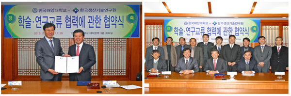 한국해양대학교(총장 박한일)는 19일 중소ㆍ중견기업의 기술 개발 지원 연구기관인 한국생산기술연구원(원장 나경환)과 학연 협력에 관한 협약(MOU)을 체결했다.