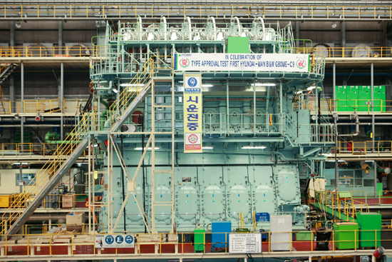 현대중공업은 최근 세계 최초로 G-타입(Green Type) 친환경 선박용 엔진(하단 사진)의 제작을 완료하고, 형식승인 테스트(Type Approval Test)를 성공적으로 마쳤다고 12일(화) 밝혔다.