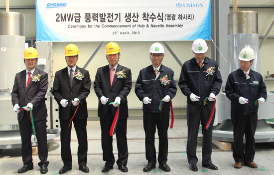 대우조선해양(www.dsme.co.kr, 사장 고재호)은 25일 국내 풍력발전기 전문 제조업체인 유니슨의 경남 사천 공장에서 하사리 풍력발전단지에 들어갈 풍력발전기 생산 착수식을 거행했다.