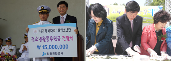 인천항만공사는 지난 11일 가정의 달을 기념해 성미가엘종합사회복지관이 자유공원에서 개최한 ‘제12회 초록 꿈 & 은빛 희망’ 행사에 동참, 공사 직원들이 모은 후원금을 전달(사진:좌측)하고 중구지역 저소득층 가정 청소년과 외로운 어르신들을 위해 진행된 다양한 프로그램을 함께 했다. (사진:박상제 인천항만공사 경영본부장이 행사 참가자들과 함께 사랑의 김밥 만들기를 하며 즐거워 하고 있는 모습.)