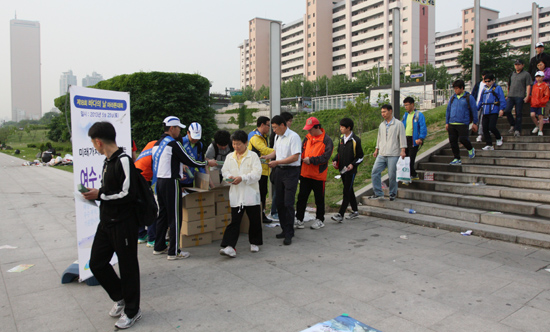 또한 공사가 미리 준비한 칫솔·치약 3,000세트는 30여분 만에 동이 날 정도로 참가자들로부터 큰 인기를 끌었다.(사진:25일 서울 여의도 한강시민공원에서 개최된 제18회 바다의날 마라톤대회에 참가한 여수광양항만공사 직원들이 참가자들에게 홍보기념품을 나눠주며 대국민 홍보캠페인을 전개하고 있다.)
