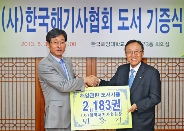 한국해양대학교(총장 박한일)는 30일 오전 대학본부 3층 회의실에서 (사)한국해기사협회(회장 민홍기ㆍ사진 오른쪽)로부터 전달받은 도서 기증식을 개최했다.