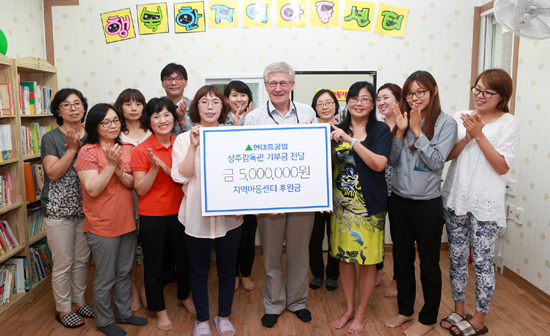 이 성금은 지난 5월 현대중공업이 울산에 상주하고 있는 외국인 감독관과 가족들을 위해 개최한 ‘상주 감독관 체육대회’에서 경품권을 판매해 마련한 것이다. (사진:현대중공업에서 파견 근무 중인 상주 외국인 감독관들이 18일(화) 오후 동구 전하동 행복한지역아동센터에서 9개 지역아동센터에 500만원의 후원금을 전달했다.)