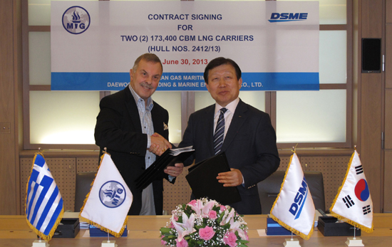 지난달 30일 고재호 사장은 그리스 아테네 현지에서 안젤리쿠시스 그룹(Angelicoussis Group)의 존 안젤리쿠시스(John Angelicoussis) 회장과 173,400㎥급 LNG운반선 2척에 대한 수주 계약서에 서명했다.(사진 : 지난달 30일 (현지시간) 그리스 아테네에서 대우조선해양 고재호 사장 (오른쪽)과 존 안젤리쿠시스 회장 (왼쪽)이 LNG선 건조 계약서를 교환한 뒤 악수를 하고 있다.)