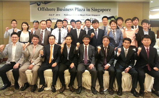 ‘2013 해양플랜트 아시아 사절단’이 지난 7월 3일부터 5일까지 2박 3일간 싱가포르에서 열린 종합상담회 및 현지 조선소 초청설명회 등에 참가해 해외 해양플랜트 시장진출의 교두보를 마련했다.(사진:‘2013 해양플랜트 아시아 사절단’과 STX조선해양, 대중소기업혁력재단, KOTRA 관계자들이 지난 4일 싱가포르 파크로얄 호텔에서 종합상담회를 마치고 해외시장 개척을 위한 의지를 다지고 있다.)