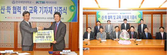 한국해양대학교(총장 박한일)는 9일 오전 11시 30분 대학본부 3층 회의실에서 ㈜케이티마린(대표이사 박옥열)과「산학 협력 및 교육 기자재 기증식」을 가졌다.