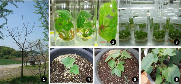 이번 연구는 나무줄기의 눈(芽; bud) 조직을 사용해 시험관에서 줄기를 대량으로 발생시키는 방법과, 모본의 뿌리를 저온 저장해 근삽으로 묘목을 육성하는 새로운 방법으로 진행됐다.