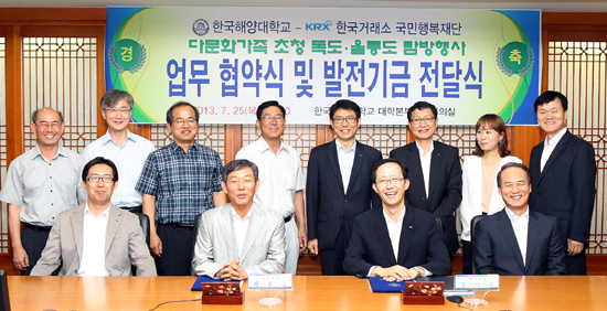 한국해양대학교(총장 박한일)는 25일 오전 대학본부 3층 회의실에서 실습선 ‘한바다호’를 활용하는 「한국사랑 국토사랑 다문화가족 초청 독도 · 울릉도 탐방행사」를 한국거래소(KRX) 국민행복재단과 공동 추진하기 위한 업무협약을 체결했다.