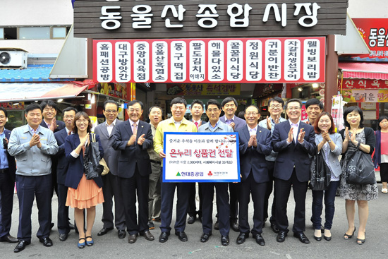 현대중공업은 12일(목) 울산 동울산시장 입구에서 전달식을 갖고, 김재훈 전무(총무부문 총괄), 김종훈 울산 동구청장과 차성근 울산동구종합사회복지관장을 비롯한 각 시설 대표 10여명이 직접 재래시장 물품을 구입하는 장보기 행사를 가졌다.(사진:김재훈 현대중공업 전무(총무부문 총괄)와 김종훈 울산 동구청장 등 관계자들이 12일(목) 울산 동울산시장 입구에서 전통시장 상품권 전달식을 가졌다.)