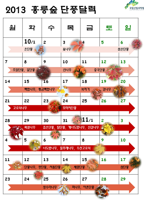 국립산림과학원(윤영균 원장)은 7일, 가을철 시기별로 단풍을 골라 감상할 수 있는 “2013년 홍릉숲 단풍달력”을 발표하면서, 기온이 갑자기 영하로 떨어지거나 가뭄이 지속되는 등의 이상기상현상이 없는 한 올해는 좋은 단풍을 기대해도 좋다고 밝혔다.