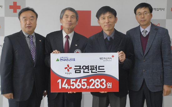 현대중공업은 지난 15일(금) 대한적십자사 울산지사에 ‘어버이 결연활동’ 후원금 1천500여만원을 기탁했다고 밝혔다. 이 후원금은 매주 2차례씩 독거 어르신가정과 조손(祖孫)가정의 밑반찬과 생필품을 지원하는데 사용될 예정이다.(사 진: 현대중공업 사회공헌팀 오세웅 부장<왼쪽 세번째>이 김석기 대한적십자사 울산지사 회장<왼쪽 두번째>에게 ‘어버이 결연활동’ 후원금 1천500여만원을 전달하고 있다)
