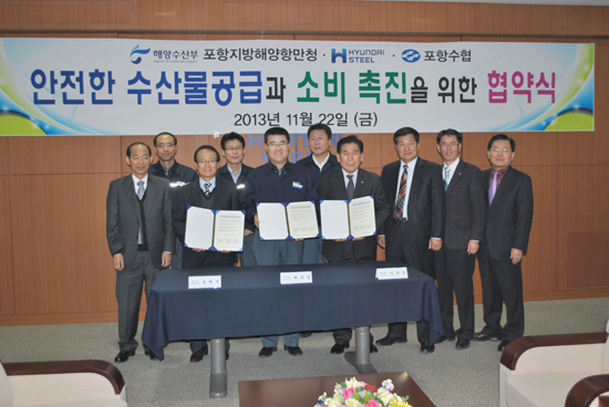 포항지방해양항만청(청장 공평식)은 2013. 11. 22일 13:30 현대제철(주) 회의실에서 포항수협, 현대제철과 안전한 수산물 공급과 소비촉진을 위한 업무 협약식을 체결한다고 밝혔다.