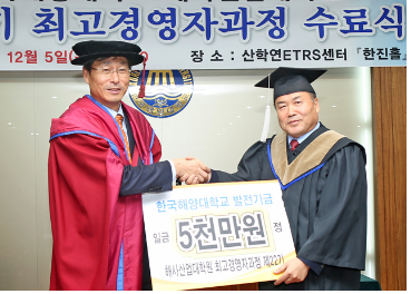한편 이날 수료식에서 22기생들은 5천만 원의 발전기금을 대학에 기탁하며 앞으로 한국해양대의 동문으로서 자부심과 긍지를 갖고 학교발전에 기여할 것을 다짐하기도 했다. (사진:왼쪽부터 한국해양대 박한일 총장, KIJ공업(주) 홍기진 대표이사(AMP22기 원우회장)