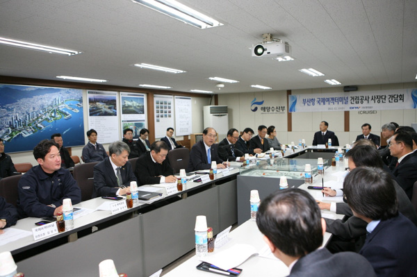 부산항만공사 임기택 사장은 11일 오전 부산항 국제여객터미널 건립공사 현장상황실에서 건설사 대표20여명을 초청, 공사 현장의 고충과 건의사항 등을 수렴하고 다양한 의견을 나누는 간담회를 가졌다.