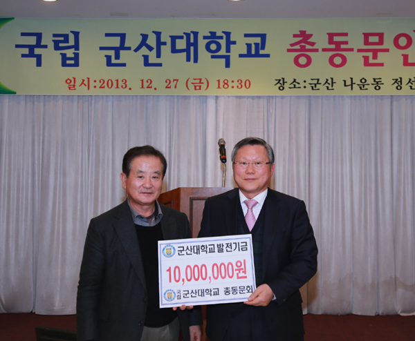 군산대학교 총동문회(회장 강봉균)는 27일(금) 저녁 군산시 나운동 정선에서 “2013년 총동문인의 밤”을 개최하고, 채정룡 총장에게 발전기금 1000만원을 전달했다.