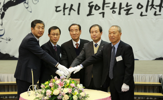 인천지방해양항만청(청장 박승기)과 인천항만공사(IPA 사장 김춘선)는 14일 오전 인천시 중구 하버파크호텔에서 인천항 주요기관 및 업·단체 관계자, 지자체와 지역경제계 대표자 등 200여명이 참석한 가운데 ‘2014년 인천항만가족 신년 인사회'를 개최했다.(사진:왼쪽부터 이상용 인천복합운송협회 회장, 박승기 인천지방해양항만청장, 심정구 인천시민원로회의 의장, 김춘선 인천항만공사 사장, 이귀복 인천항발전협의회 회장.)