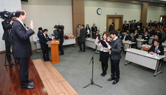 또 이날 참석한 손재학 해양수산부 차관이 창립10주년을 맞은 부산항만공사 임직원들에게 축사를 하고 있는 가운데 BPA 2030 비전으로 ‘글로벌 허브항만을 창조하는 국민기업’을 발표한 부산항만공사 직원들이 사장 앞에서 실천을 다짐(상단 사진)하고 있다.