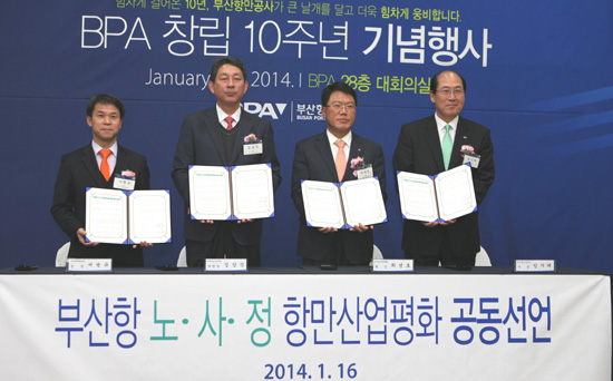 더불어 이날 행사엔 부산항의 발전을 위해 공동 협력을 다짐하고 노.사.정 항만산업 평화 공동선언문을 발표한 서병규 부산지방해양항만청장과 김상식 부산항운노동조합위원장, 최성호 부산항만물류협회 회장, 임기택 부산항만공사 사장 등(상단 사진)이 참석했다.