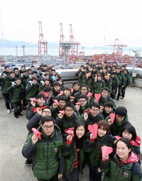2014년 신입사원 입문과정의 일환으로 진행된 이번 현장견학에서는 61명의 신입사원들이 광양항 3-1단계 CJ대한통운 컨테이너 터미널과 대전 문평동 택배 메인허브터미널을 찾아 회사의 사업 현황을 직접 확인해보는 시간을 가졌다. (사진:CJ대한통운은 2014년 공채 신입사원 61명이 11일 광양항과 대전허브터미널 현장을 방문했다고 12일 밝혔다. 광양항 CJ대한통운 컨테이너 부두를 방문한 신입사원들이 CJ로고 형태로 모여 미래에 대한 희망을 담은 3색 종이 비행기를 손에 들고 포즈를 취하고 있다.)