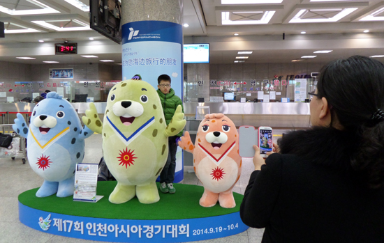 인천항만공사(IPA 사장 김춘선)는 오는 9월 개최되는 2014 인천아시안게임의 공식 마스코트 ‘비추온’, ‘바라매’, ‘추므로’ 물범 3남매 조형물 포토존을 인천항 제1국제여객터미널에 설치했다고 14일 밝혔다. <사진:인천항 제1국제여객터미널에 설치된 아시안게임 마스코트 포토존.>