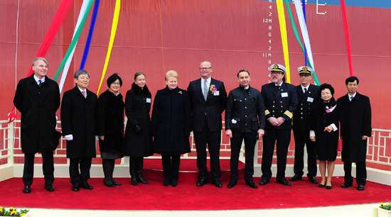 (사진:리투아니아의 달리아 그리바우스카이테 대통령이 명명식의 대모(代母)로 나서 선박에 ‘인디펜던스(Independence)호’라는 이름을 부여하는 세리머니를 하고 있다. 이 선박은 리투아니아 정부의 에너지 독립을 상징하는 의미로 ‘인디펜던스(Independence)호’로 명명됐다. 리투아니아 달리아 그리바우스카이테 대통령 앞줄 좌측서 두 번째, 현대중공업 이재성 회장 우측서 첫 번째, ‘회그LNG’사 레이프 회그 부회장 우측서 네 번째)