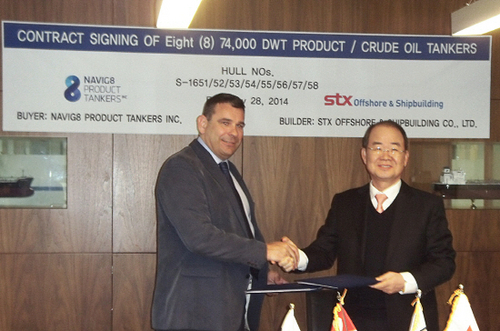STX조선해양은 최근 싱가포르 선사인 나빅8사와 7만4,000DWT급 탱커 12척(옵션 4척 포함)의 수주계약을 체결했다고 3일 밝혔다. 총 계약금액은 약 6,200억원이다.