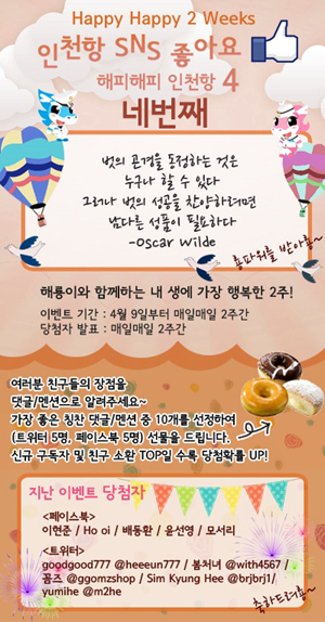 다양한 기획을 통해 구독자와 활발히 교감하면서 인천항의 대 국민 소통 창(窓)으로 확실히 자리매김해 가고 있는 인천항 소셜네트워크서비스(SNS)가 이벤트를 통한 신규 구독자 확보에 나섰다.인천항만공사(IPA 사장 김춘선)는 인천항 공식 트위터*와 페이스북 페이지**를 통해 ‘해피해피 인천항’ 이벤트를 진행 중이라고 14일 밝혔다. 지난 9일 시작된 이벤트는 오는 22일까지 진행된다. * 인천항 공식 트위터 주소 https://twitter.com/portincheon** 인천항 페이스북 페이지 주소www.facebook.com/incheonport