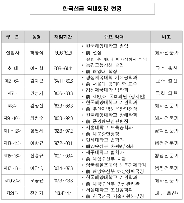 이처럼 역대 한국선급 회장은 다양한 분야 전문가로, 이들의 출신대학은 서울대, 한국해양대, 연세대, 제주대, 해외 대학 등으로 분석되고 있다.