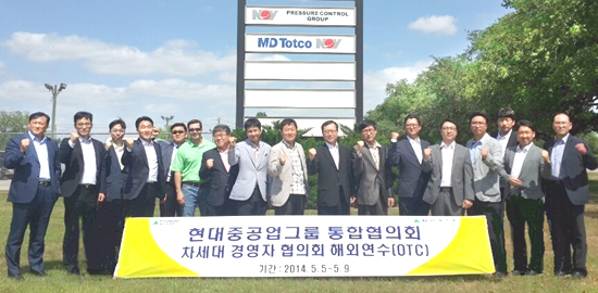 OTC는 전 세계 50여개국, 2천500여개 업체에서 9만여명의 관계자들이 참여하는 세계 최대 규모의 해양플랜트 기자재 전시회 및 기술 컨퍼런스다.‘차세대 경영자 협의회’는 현대중공업 협력회사의 30•40대 경영자들이 경영 역량과 회사의 글로벌 경쟁력을 높이기 위해 지난해 9월 결성한 모임이다. (사진: 미국 휴스턴에서 열린 ‘해양기술박람회(OTC)’를 참관 후, National Oilwell Varco(NOV)를 방문한 현대중공업 협력회사 대표들)