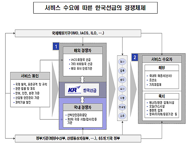 한국선급 출범 후 지난 54년동안 축적된 기술전문성을 기초로 100년이상의 역사를 가진 영국,미국,독일,프랑스,일본선급 등 선급과 각 국가의 검사 대행권 확보와 세게 주요외항선사의 선박 입급과 이들 선박 등 검사를 위해 치열한 경쟁을 벌이고 있는 상황이다.
