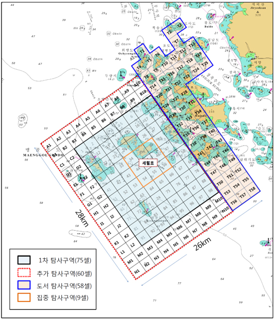 대책본부는 사고해역 희생자 수색 지원을 위해 지난 4월 29일부터 5월 10일까지 해양조사원 선박 2척을 포함해 모두 10여척의 선박을 투입하여 해저영상탐사를 시행중에 있다.해저영상탐사 현황(Cell당 2km×2km)