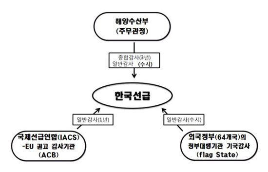 한국선급은 해양수산부 감사규정 제19조에 따라 해양수산부로부터 종합감사를 3년마다 받고 있다. 아울러, 해양수산부 정부대행 협정문에 따라 검사업무 전반에 대해 수시 지도 감독감사를 수감하고 있으며, 지난 1011년에 해양부로 부터 종합감사와 2013년 지도․감독에 따른 감사를 받았다.