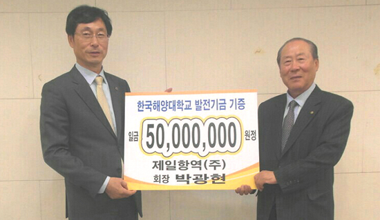 제일항역(주) 박광현 회장은 13일 서울 명동에서 모교 한국해양대학교(총장 박한일)의 발전과 우수 인재 양성을 위해 5천만 원의 발전기금을 전달했다.