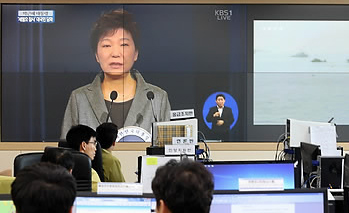 박근혜 대통령은 19일 발표한 세월호 침몰 사고 관련 대국민담화에서 이번 사고 발생 이후 문제점으로 지적된‘관피아(관료+마피아)’ 문제에 대해 강력한 척결 의지를 밝히고 공직사회 폐쇄성과 무사안일을 혁파하기 위해 5급 공채와 민간경력자 채용을 5대5 수준으로 맞출 것이라고 밝혔다.박 대통령은 이날 “이번 사고는 오랫동안 쌓여온 우리 사회 전반에 퍼져 있는 끼리끼리 문화와 민관유착이라는 비정상의 관행이 얼마나 큰 재앙을 불러올 수 있는지를 보여주고 있다”며 해수부 퇴직관료의 해운분야 재취업 관행의 문제점을 하나하나 지적했다.(사진:박 대통령의 담화를 해양부 직원들이 상황실에서 듣고 있다)
