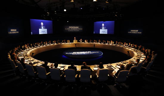존 메이저 전 영국 총리, 미국 재무부 장관을 지낸 로렌스 서머스 하버드대 교수, 2013년 노벨 경제학상 수상자 로버트 쉴러 예일대 교수를 비롯한 글로벌 리더와 석학, 글로벌 기업 CEO 등이 모여 세계 정세와 경제를 진단하고 미래 경영환경을 전망한 ‘2014 두산 글로벌 비즈니스 포럼’이 18일(현지 시각) 영국 맨체스터에서 열렸다.
