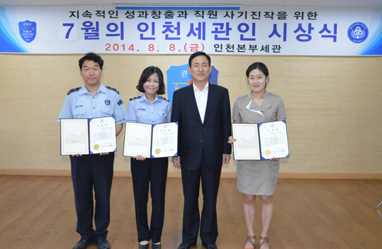 인천본부세관(세관장 박철구)은 8월8일(금), 소통을 통한 갈등해소로 인천항 최초의 중소기업 면세점 개장에 성공한 백미숙 관세행정관(43,여)을 “7월의 인천세관인”으로 선정 시상했다고 밝혔다.(사진:왼쪽부터 최낙현, 백미숙, 세관장, 제일 오른쪽 김경아)