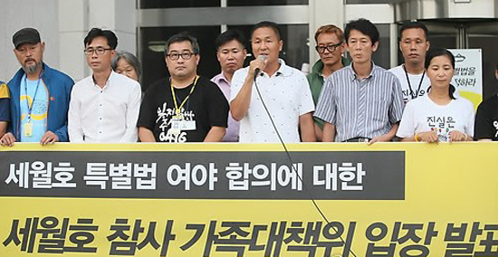 이에 앞서 세월호 가족대책위원회 김병권 위원장과 유가족들은 7일 국회 본청 앞에서 이날 여야가 합의한 세월호 특별법에 대해 반대하며 수사권과 기소권이 포함된 특별법 제정을 촉구하고 나섰다(하단 사진).