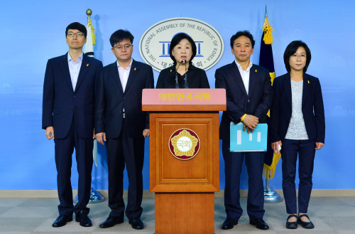 정의당 심상정 원내대표는 8일 국회에서 기자회견을 열고 "신뢰할만한 수사권과 기소권이 부여되지 못해 진상조사 활동이 사실상 무력화될 수 있는 특별법 제정에 반대한다"면서 "350만명의 국민청원, 목숨을 내건 유족들의 처절한 단식, 생존 학생들의 100리 도보행진 등 세월호 특별법 제정을 위한 전 국민적인 노력을 깡그리 무시해버린 폭거"라고 주장했다.(사진:심상정 정의당 원내대표를 비롯한 의원들이 8일 오전 국회 정론관에서 세월호특별법 여야 합의를 규탄하는 기자회견을 하고 있다. (왼쪽부터) 서기호, 박원석, 심상정, 정진후, 김제남 의원.)
