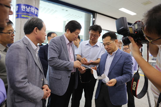 (사진:김영석 해양수산부 차관이 지희진 인천지방해양항만청장으로 부터 인천항 연안여객터미널에서 새로 도입된 자동승선권 발권시스템에 대한 보고를 받은 후 발매된 승선권의 기재사항을 살펴보고 있다.)