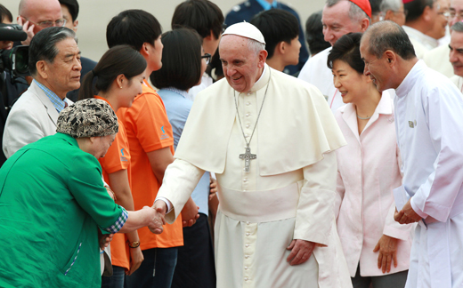 프란치스코 교황이 14일 한국에 도착해 4박 5일간의 공식 일정을 시작했다. 프란치스코 교황은 이날 오전 공항으로 마중 나온 박근혜 대통령과 한국천주교 주교회의 의장 강우일 주교, 서울대교구장 염수정 추기경 등의 영접을 받았다.