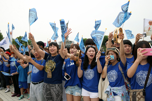 불필요한 의전을 원하지 않는 교황의 뜻에 따라 이날 공항에서의 환영행사는 간단하게 치렀다. (사진:14일 오전 프란치스코 교황이 탑승한 차량행렬이 서울 청와대 분수대 앞을 지나 종로구 궁정동 주한 교황청대사관으로 향하자 천주교 신자들이 환호하고 있다.)